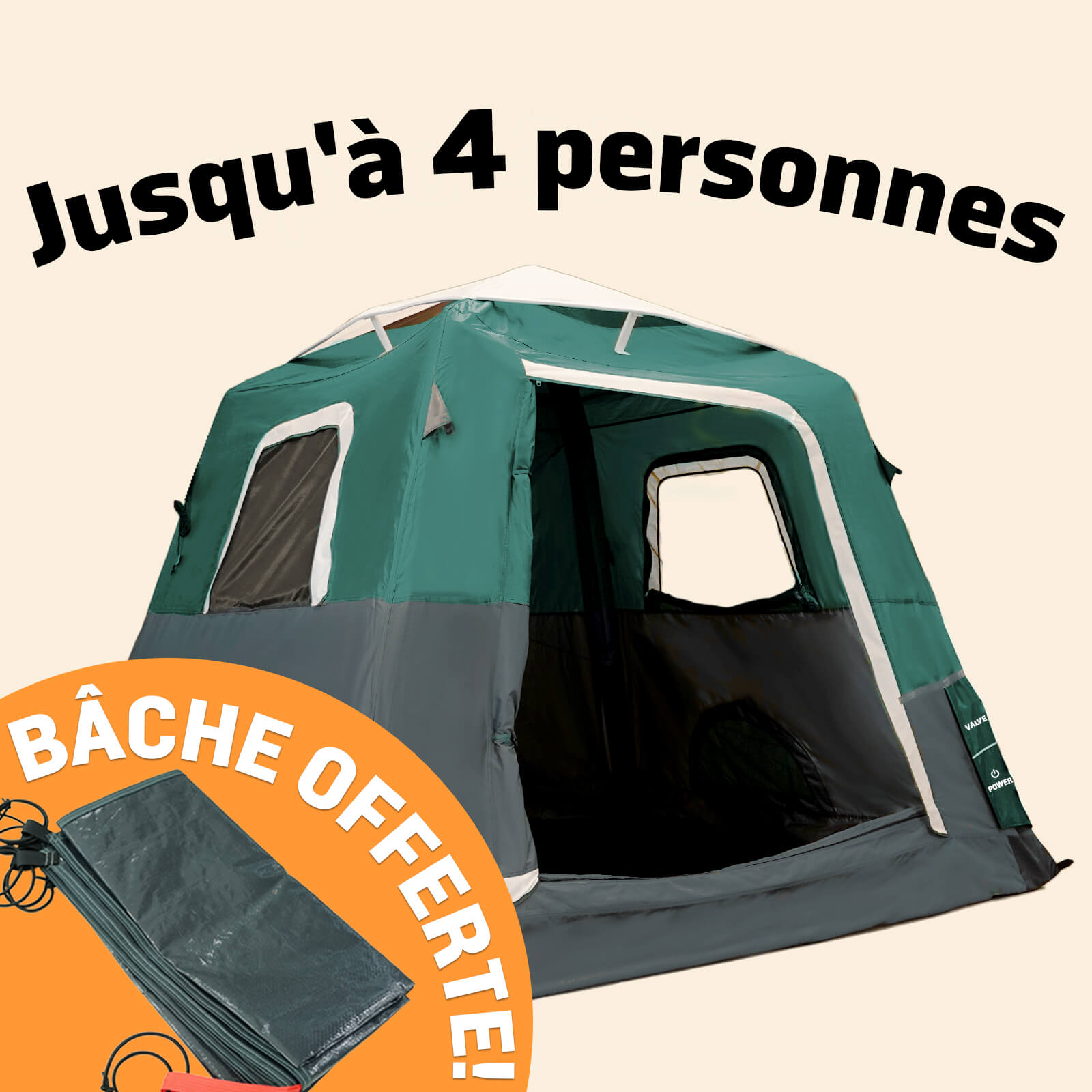 2-Step Cabin Tent – Petite taille + Bâche de camping OFFERTE (jusqu’à 4 personnes, FR).