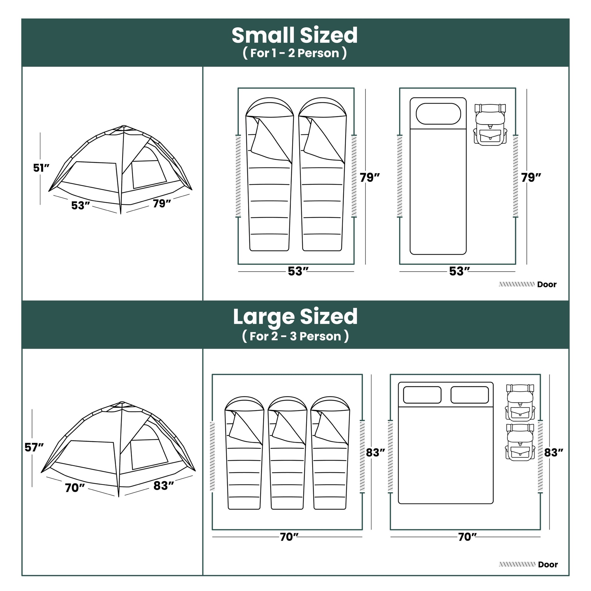Small Tent (For 1-2 Person): 79" x 53" x 51" (Packed Size: 27.2" x 5.9" x 5.9"); 8lbs